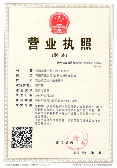 鄭州慧澤生化科技有限公司是一家充滿朝氣的科研生產型高技術企業。目前公司業務主要集中在精細化工、食品化工和微生物制劑行業。公司現已建成鄭州、焦作、新鄉三個生產基地,其中河南新鄉輝縣孟莊生產基地占地70畝,總投資達1.2億?,F擁有年產100000噸過氧化氫消毒劑,年產8000噸的過氧化鈣和年產5000噸的雙乙酸鈉的生產線,同時開設有生產總量5000噸的枯草芽孢桿菌、地衣芽孢桿菌等微生態制劑發酵生產車間。公司始終堅持“以人為本,科技興企,品質優良,用戶滿意”的經營宗旨。為客戶創造價值更多的價值...